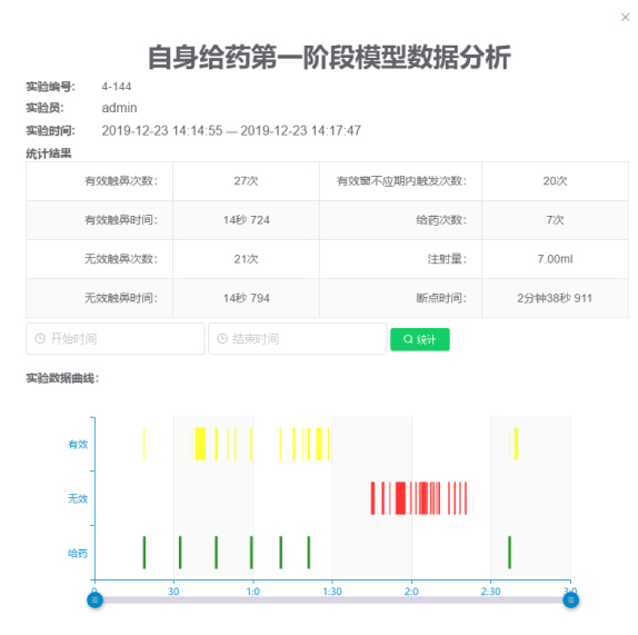 軟件分析的數(shù)據(jù)有:實(shí)驗(yàn)時(shí)間,有效觸發(fā)次數(shù),無(wú)效觸發(fā)次數(shù),給藥次數(shù)(投食次數(shù)),有效觸發(fā)時(shí)間,無(wú)效觸發(fā)時(shí)間,斷點(diǎn)時(shí)間,不應(yīng)期內(nèi)觸發(fā)次數(shù)等